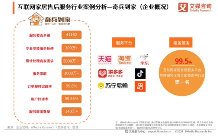2024年5月,奇兵到家獲iiMedia Research(艾媒咨詢)授予的“互聯(lián)網(wǎng)家居售后服務(wù)平臺·師傅服務(wù)區(qū)域全國覆蓋率行業(yè)第一名”市場地位確認。截至2024年4月,奇兵到家的業(yè)務(wù)范圍已覆蓋全國600多個城市、近3000個縣區(qū)41162個鄉(xiāng)鎮(zhèn),服務(wù)商家企業(yè)超過140萬+,服務(wù)家庭達3000萬+,師傅服務(wù)區(qū)域的全國覆蓋率高達99.5%。