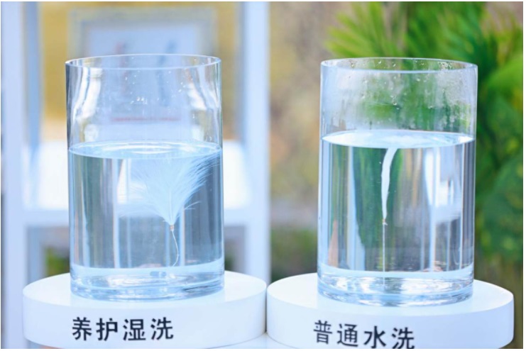 直播中,工作人員還針對羊毛、真絲等高端面料進行了模擬洗護實驗。可以看到,模擬羊毛纖維的羽毛在普通溶液中呈現粘連現象,而濕洗溶液中的羽毛則根根分明。