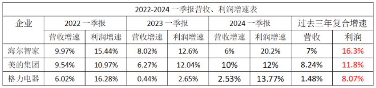 家電股是A股重要的“白馬股”,也是基金重倉股,屬于長線投資標的,因此過去三年復合增長率是非常重要的指標。我們從第一季度利潤增速以及過去三年復合增長率來看,海爾智家都TOP3最高,特別是2024Q1利潤增速超過20%,刺激了股價大漲。