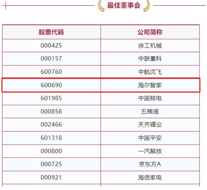6月30日,海爾智家斬獲由《董事會》雜志評選的第十九屆中國上市公司董事會“金圓桌獎”公司大獎——最佳董事會獎,且位居行業榜首。