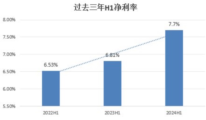第二個是:凈利潤率再提高,創(chuàng)近3年“新高”。凈利率從2022上半年的6.53%提升至2023上半年的6.81%,再到今年上半年的7.7%。