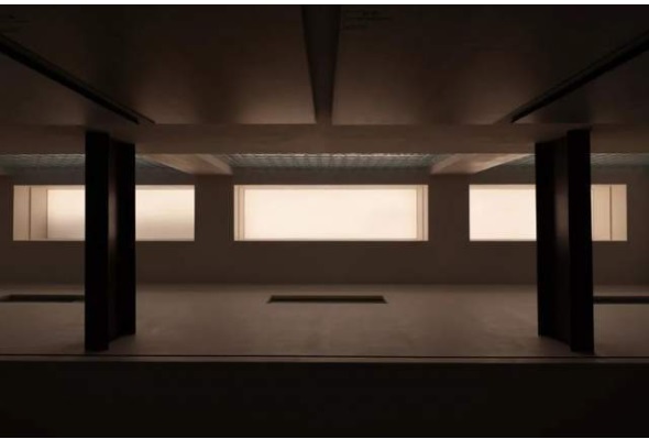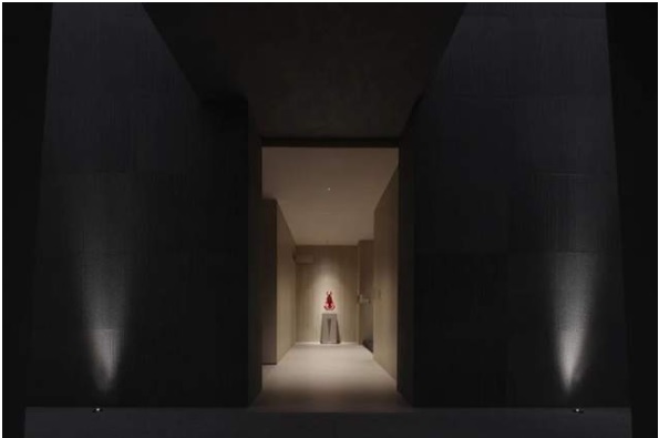 入目左側(cè)墻體采用巖板材質(zhì)由下往上傾斜,右側(cè)則采用大理石進(jìn)行拉槽處理,兩兩對(duì)望,巖板微傾,暗含巖板向大理石致敬之意。同時(shí),借助層高7米的原生建筑優(yōu)勢(shì)塑造了靜謐而深遠(yuǎn)的峽谷意象,建筑頂部引入天光,令立面墻體變得更加柔和有度。空間上則是呈現(xiàn)多維度多層次的博物館場(chǎng)景體驗(yàn),通過燈光變換,引導(dǎo)訪客順光而行,進(jìn)而開啟光的序幕。