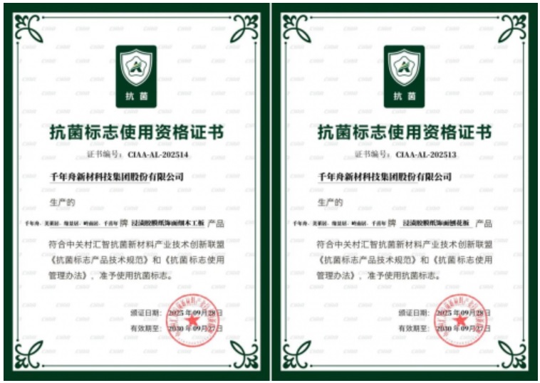 2025年10月9日,千年舟集團旗下浸漬膠膜紙飾面細木工板與浸漬膠膜紙飾面刨花板獲得CIAA頒發的抗菌標志證書。兩款核心產品通過嚴苛檢測,抗菌性能達到行業權威標準,為全屋定制市場注入健康新動能,更標志著千年舟 “環保 + 功能” 的雙核心戰略再獲實質性突破!
