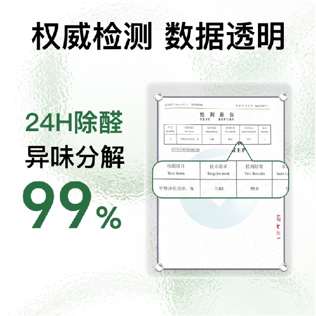 原理說明:環康除醛酶采用“植物氨基+光觸媒”雙效體系,突破了傳統光觸媒光線限制的局限,有光無光均可以分解甲醛。其24小時除醛率高達90%以上,且持久性較好。