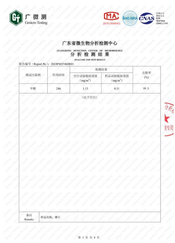 睿石是一種天然礦石,呈不規則形狀。睿石經特殊工藝活化后會生成豐富的孔隙,具有發達的孔隙結構、超大的比表面積。其比表面積是活性炭的幾十倍,且內部孔隙與甲醛分子大小相仿,所以睿石具備吸附甲醛等污染物的功效,能起到高效凈化空氣的作用。