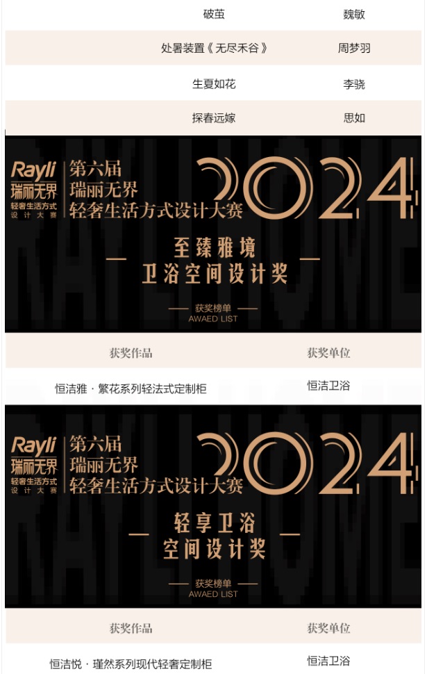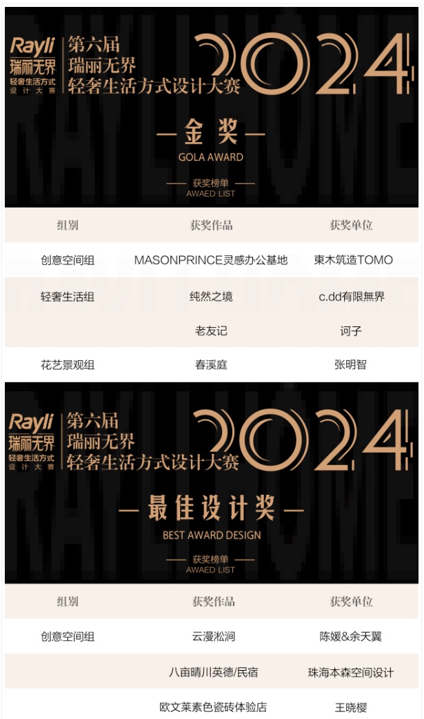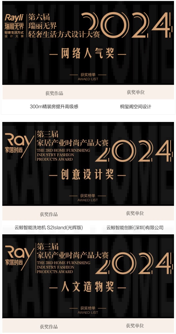 第三屆家居產業時尚產品大賽和第六屆Rayli瑞麗無界•輕奢生活方式設計大賽的頒獎儀式成為本次大會中最激動人心的一環,經過作品的征集、初審、專家評審等程序,獲獎作品從眾多參賽作品中脫穎而出!