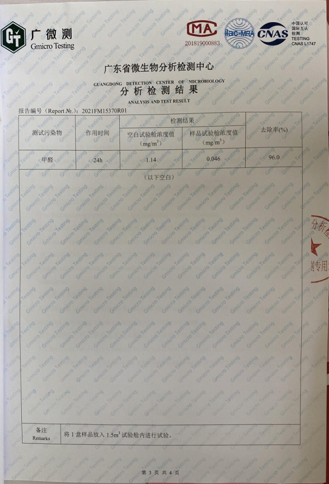根據《中國室內空氣質量標準》(GB/T18883-2002),有效的推薦葉廣泥(甲醛去除率96%,甲苯去除率98%)附檢測報告:
