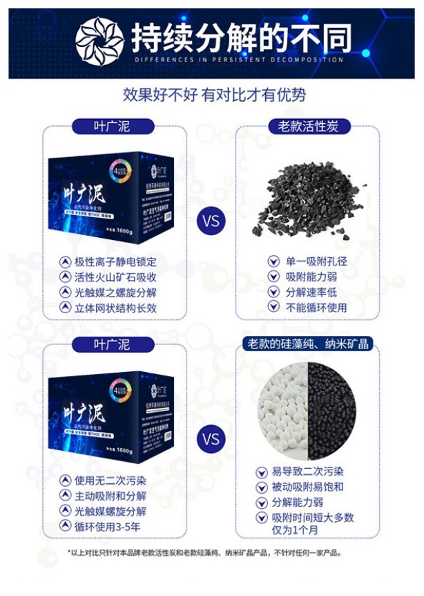 葉廣泥和活性炭不一樣,活性炭只能吸附,用一段時間以后吸附會飽和,葉廣泥不僅僅是吸附,是吸附后可以分解有害物質,不會再釋放,不需要暴曬,可以持久分解,使用3年。