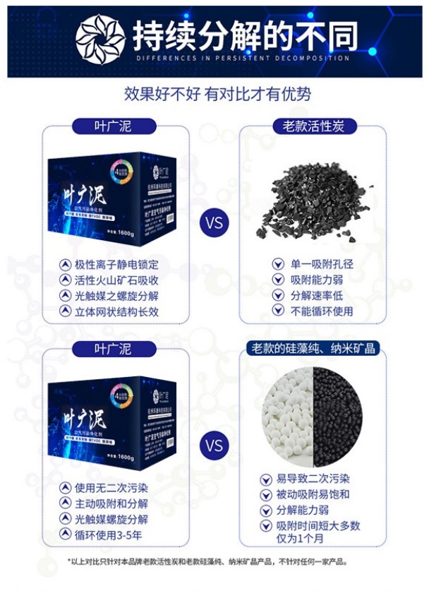 葉廣泥和活性炭不一樣,活性炭只能吸附,用一段時間以后吸附會飽和,葉廣泥不僅僅是吸附,是吸附后可以分解有害物質,不會再釋放,不需要暴曬,可以持久分解,使用3年。