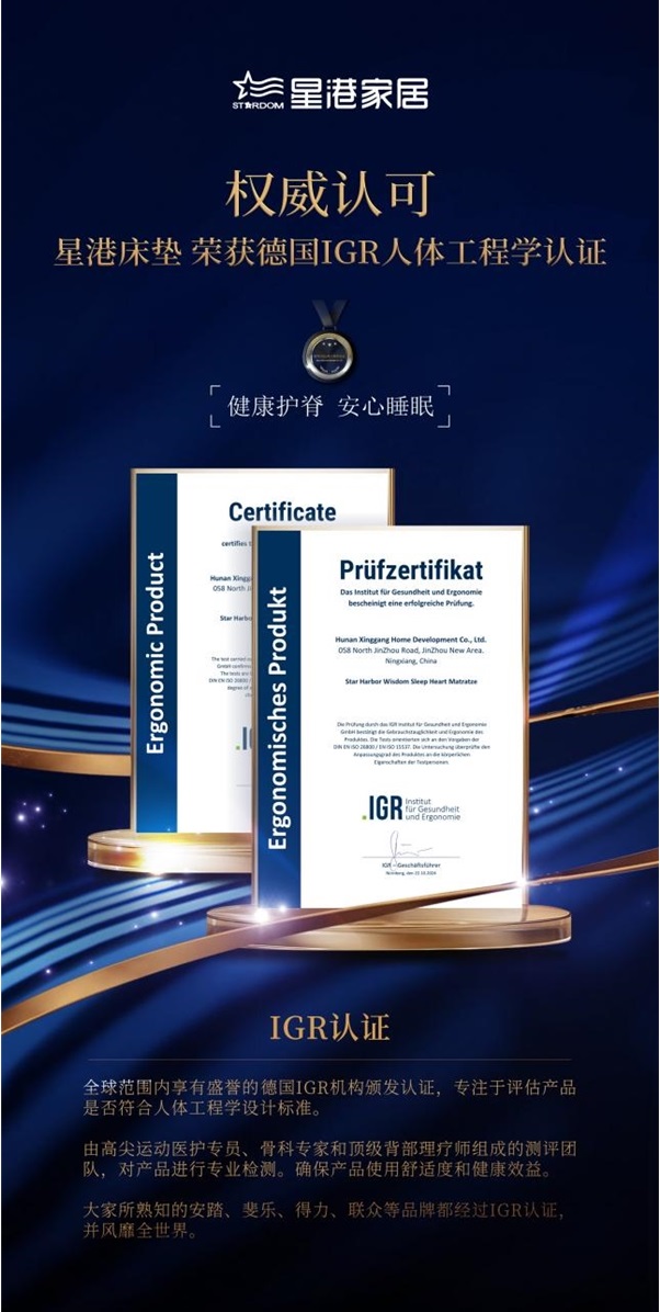 作為40年國民睡眠品牌,星港家居始終以專注與創新,踐行“健康睡眠守護者”的使命。再次迎來里程碑——通過全球權威的德國IGR人體工程學認證,成為國內少數獲此殊榮的品牌之一。