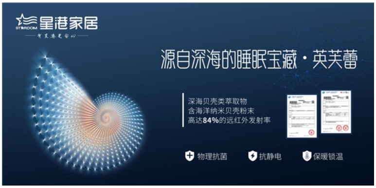 星港家居從深海貝殼中提取,打造含有天然生物高分子聚合物的英芙蕾纖維。這一材質(zhì)經(jīng)國家抗菌檢測,金黃色葡萄球菌、大腸桿菌、肺炎克雷白(伯)氏菌抑菌率均高達(dá)99%。
