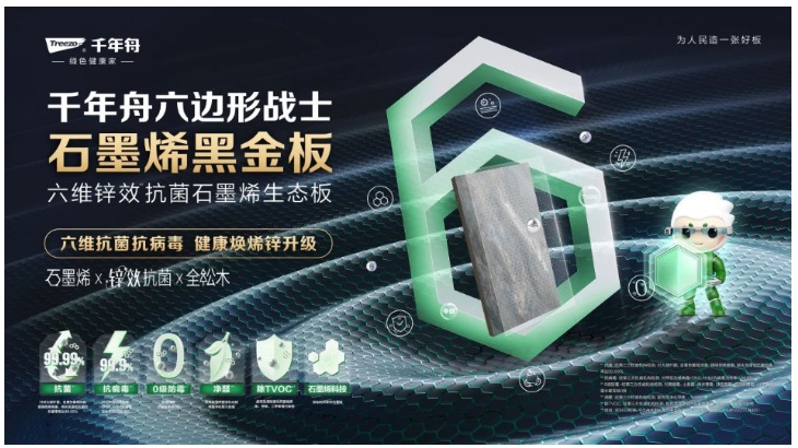 千年舟“六邊形戰士”——石墨烯黑金板(六維鋅效抗菌石墨烯生態板)的誕生,就是千年舟科技創新成果的完美體現,將被譽為“新材料之王”的石墨烯,與家居板材巧妙融合,通過添加石墨烯這一新型材料,千年舟實現了板材功能的再次突破,不僅具備抗菌、抗病毒、防霉的防護功能,還升級了凈醛、除TVOC的全新性能,全松木打造,對家的守護力加倍。