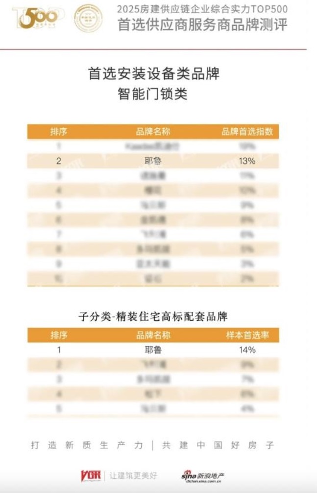 2025年3月19日,2025房地產TOP500測評成果發布會暨房地產企業發展高峰論壇在北京盛大舉辦,同期,中房優采平臺正式發布了《2025房建供應鏈綜合實力TOP500-首選供應商服務商品牌測評研究報告》(以下簡稱報告)。發布會上,Yale耶魯智能鎖榮膺“中國地產500強智能門鎖——精裝住宅高標配套類TOP1”,并贏得“智能鎖品類TOP2”。這不僅是Yale耶魯第8年入選該榜,更是品牌連續第4年榮登榜單第一,榮耀的背后,Yale耶魯作為智能鎖和住宅智慧安防解決方案的引領者之一,將與更多業界同行一起載譽向前,推動智能家居新浪潮的高質量發展。