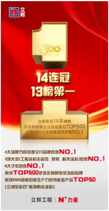 立邦連續14年蟬聯房建供應鏈企業綜合實力TOP500首選工程涂料全品類第一
