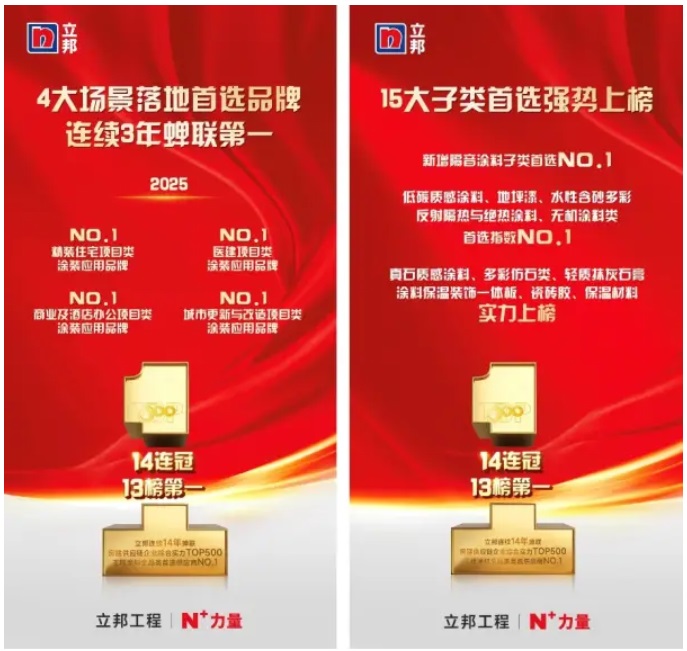 3月19日,由中國房地產業協會指導,中房優采正式發布《2025房建供應鏈企業綜合實力TOP500-首選供應商服務商測評報告》,立邦再次獲評工程涂料全品類第一,連續14年穩居行業榜首。在本次發布的榜單中,立邦在五大類、十五個子類上榜,穩居13項測評榜單冠軍,并在新增的隔音涂料子類榜單中奪冠。