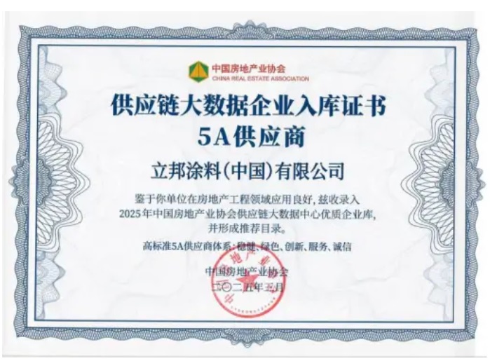 立邦被收錄入中國房地產業協會供應鏈大數據中心并高標準“5A供應商”(5A即5大能力)企業庫