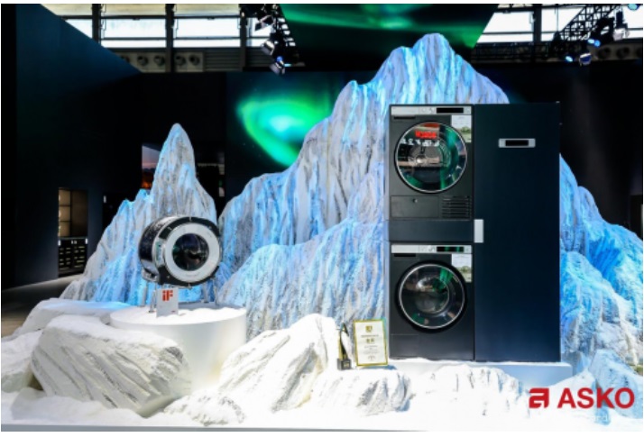 走進(jìn)ASKO展廳,第一視覺是以冰川秘境為靈感的洗衣房造景,巨型冰山造型藝術(shù)裝置與金屬質(zhì)感產(chǎn)品交相輝映,瞬間將參觀者引入凜冽而純凈的北歐極地幻境。
