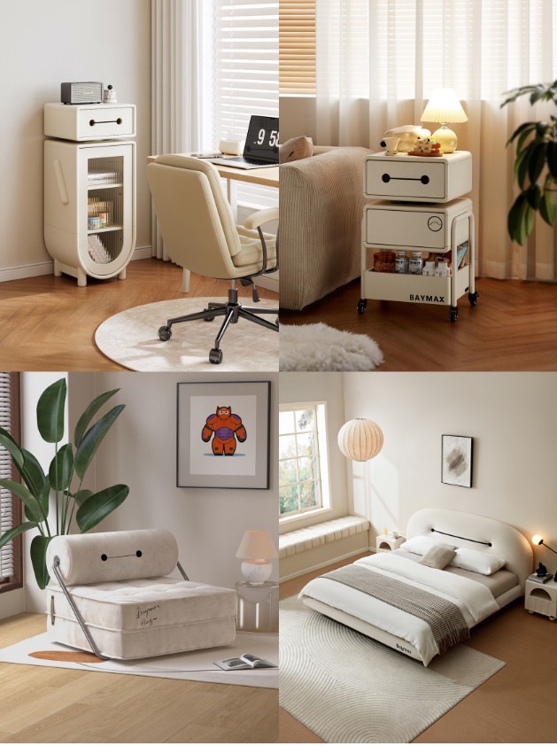 在產(chǎn)品設(shè)計(jì)上,全友將“功能輕量化”與“情緒治愈力”巧妙融合,實(shí)現(xiàn)了IP精神的空間轉(zhuǎn)譯。例如大白頭部造型的移動(dòng)邊幾,360度可旋轉(zhuǎn)抽屜設(shè)計(jì)既保留了IP的趣味性,又通過(guò)靜音萬(wàn)象輪與大容量收納滿足小戶型的實(shí)用需求。