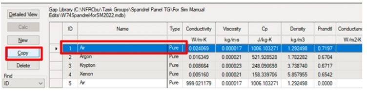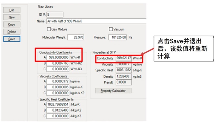 選中“Air”(類型為Pure)并制作一個“副本”,打開新創建編號并將其重命名,以便用戶不會將其與常規的“Air”混淆。改變將“Conductivity導熱系數”下單元格“A”中的值設置為999(公制單位)。所有其它值保持不變,保存并退出。見下圖復制ID#1到ID#5以獲取新空腔的導熱系數。