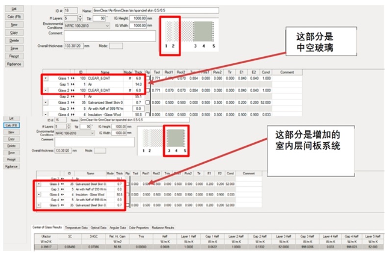 在此步驟中,創建整體層間板系統(將步驟1的中空玻璃和不透明層間板構件組合),計算得到層間板系統整體COG U值和SHGC,并用于面積加權電子表格。創建的該系統不會被導入到THERM中。如果層間板構件在Glass Layer Library(玻璃層庫)中不可用,那么它們將被要求由建模師自建。層間板構件包括但不限于金屬板和保溫材料。