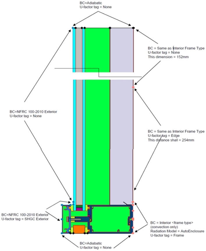層間板系統的建模過程與典型的可視幕墻系統不完全相同。默認情況下,WINDOW使用63.5mm作為玻璃邊緣U值的計算范圍。然而,在層間板系統建模時,建模師需要在THERM中定義254mm作為層間板邊緣U值的計算范圍,并使用電子表格,通過面積加權來計算整體產品。面積加權電子表格可由建模師自建,但應與 NFRC Spandrel Benchmark(NFRC層間板參照表)的結果進行比較用于驗證該電子表格。