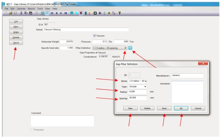 5. 定義完真空空腔的壓力和支撐柱后,單擊 Save 和Ok。請注意,支撐柱的導熱系數不是輸入值,由于支撐柱的材料熱導率全都超過了玻璃,因此即便導熱系數不同,對閾值也沒有影響。隨著未來的發展和創新,WINDOW 軟件的后續版本將具有指定支撐柱熱導率的選項。新的支撐柱定義方法將提供下拉列表選擇,并基于保存的任何新支撐柱參數。然后,點擊 Save,將真空空腔的參數保存到Gap Library(空腔氣體庫)。在下拉列表中選擇的支撐柱將作為在Glazing System Library(玻璃系統庫)中構建真空玻璃時使用的唯一支撐柱類型,如果存在多個真空空腔和支撐柱類型,則需要使用額外的空腔氣體記錄;如果有多個真空空腔,但空腔壓力和和支撐柱類型相同,則真空空腔可以根據需要多次重復使用。