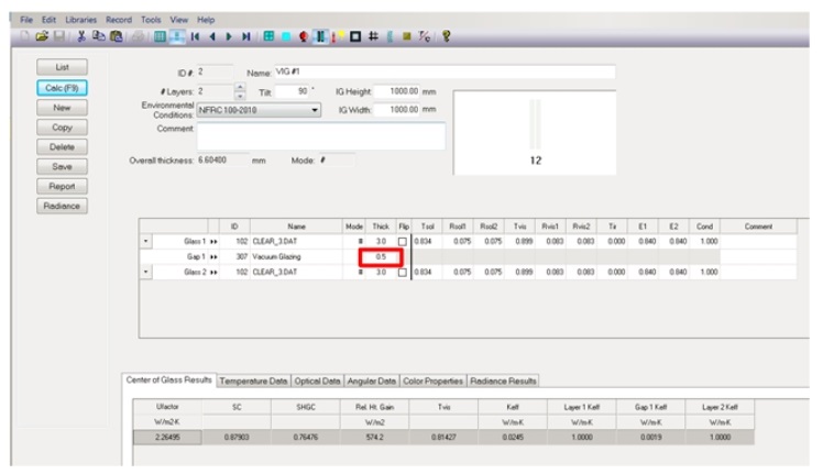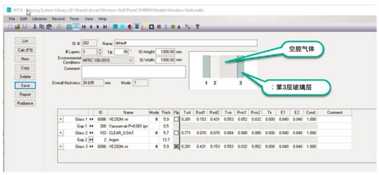 2. 打開新的玻璃系統編號,更新名稱,然后選擇玻璃層和真空空腔生成真空玻璃單元。注意需要調整空腔寬度以匹配廠商的產品規格,計算并保存用于導入THERM的玻璃系統。