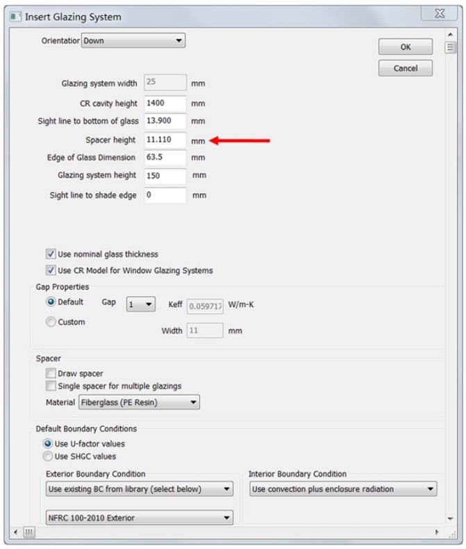 1. 正常設定所有玻璃系統參數,Spacer Height(間隔條高度)應與廠商實際產品的封邊高度一致。