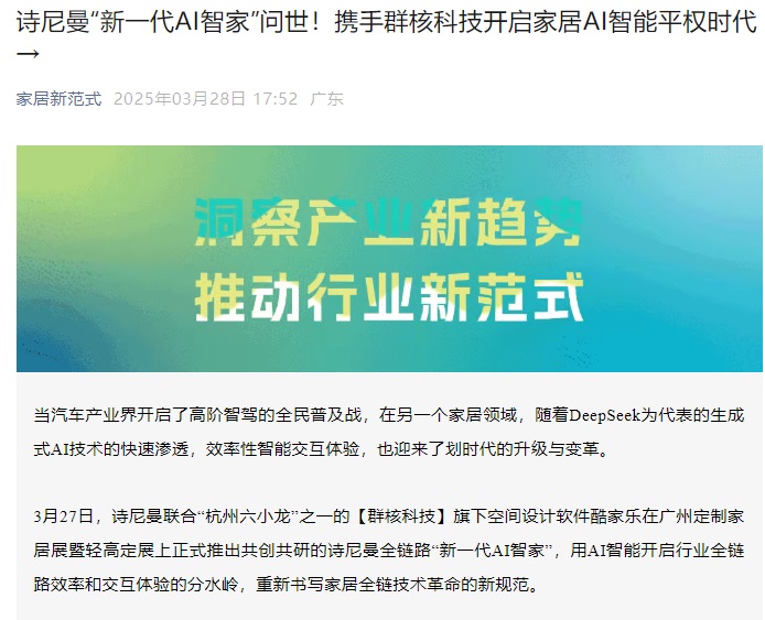 詩尼曼2025廣州定制展引發(fā)的“新一代AI智家”浪潮,吸引行業(yè)內(nèi)外50+頭部媒體深度剖析。行業(yè)媒體將展館定義為“現(xiàn)象級商業(yè)試驗場”,盛贊“日均5000客流重構(gòu)展會流量法則”,聚焦“50+N無界店態(tài)瓦解渠道邊界邏輯”,更以“攜手群核科技開啟AI智能平權(quán)”驗證詩尼曼家居劃時代升級與變革的實力。