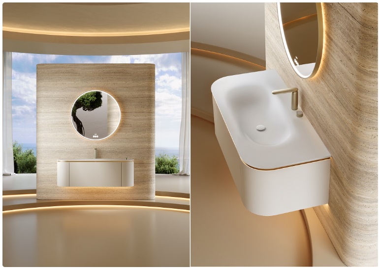 另一款浴室柜則以單盆設(shè)計(jì)為核心,杏子灰飾面與圓弧邊角設(shè)計(jì)碰撞出幾何韻律。臺(tái)面下及柜底延續(xù)人體感應(yīng)燈設(shè)計(jì),智能鏡面觸控響應(yīng)便捷精準(zhǔn),盡顯智慧交互的魅力。