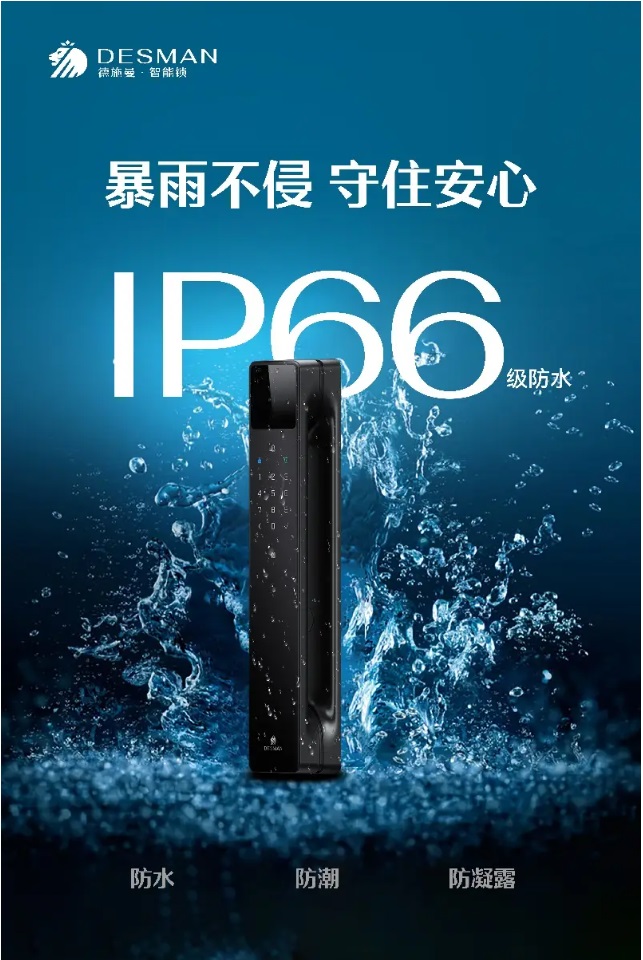 據了解,當前智能鎖行業國標對于產品防水的要求是IP52級別,很難解決暴雨天、回南天、冷凝水等特殊場景下的鎖具故障。德施曼本次發布的IP66級別防水技術是目前行業主流品牌最高防水等級。