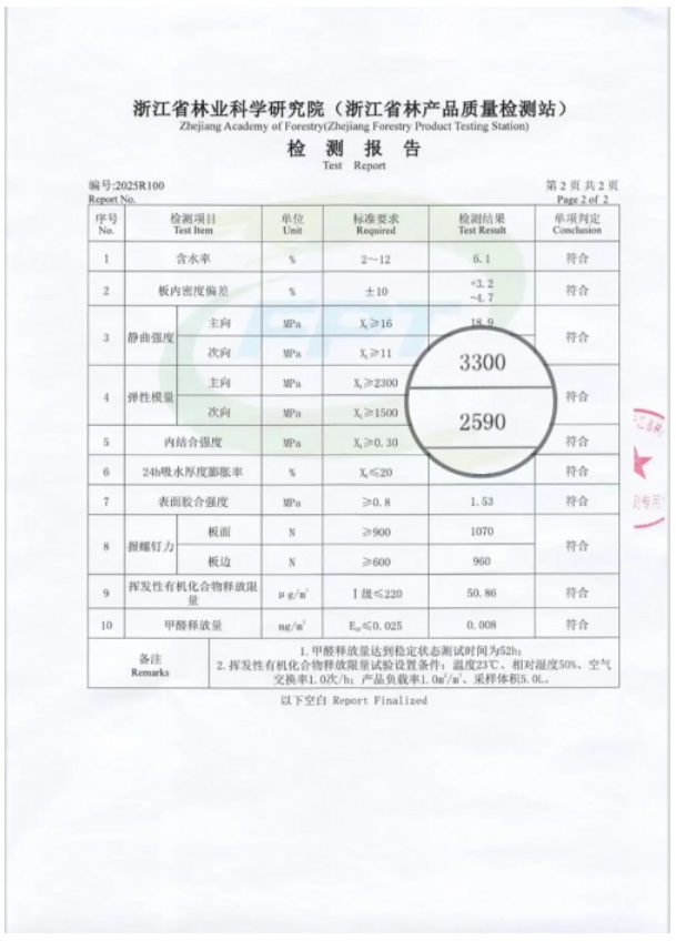 F-OSB2型(可飾面定向刨花板)在靜曲強度、彈性模量、內結合強度和24h吸水厚度膨脹率性能上都有較高要求,依據檢測報告數據顯示,金澳F-OSB2凈楊澳享板性能超越國標F-OSB2型標準要求。