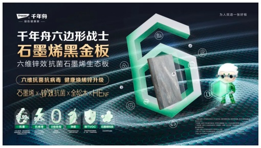 千年舟石墨烯黑金家族,涵蓋石墨烯黑金板、石墨烯新生態地板、石墨烯墻板等產品,其以尖端科技內核,實現抗菌、抗病毒、0級防霉、凈醛、除TVOC和石墨烯的六維智護,為每個家庭織就環保健康的防護網。