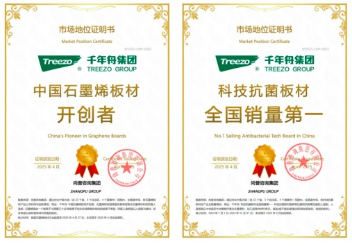 智創黑金科技,更獲得了市場地位認證加持。2025年4月,千年舟獲得“中國石墨烯板材開創者”、“抗菌科技板材全國銷量第一”等四大市場地位認證(數據來源尚普咨詢集團)。黑金科技行業領先,是科技與健康的標桿之作。