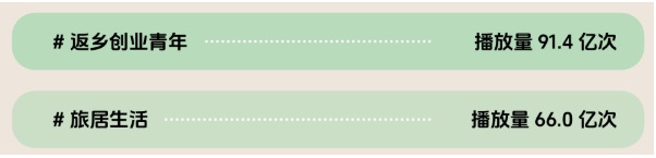 另外,我們也看見了生活方式的改變,帶起新的居住趨勢。#旅居生活、#返鄉創業青年 等話題持續受到關注,#住進風景里 話題曝光更達279.6億次。這些數據背后,是遠程辦公、旅居、雙城生活、歸園田居等新生活方式的興起。