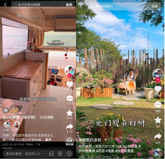 比如@杰瑞有個漂亮家,她原本是短劇導演,懷孕后開始設計、記錄自己的家。她的家有各種收納巧思,還有專為孩子設計的躍層童話屋,吸引了超過21萬寶媽寶爸關注。大廠裸辭后定居大理的@活力少女阿珍,則在抖音記錄著從北京到大理、從大廠到蓋民宿的完整居住轉變。