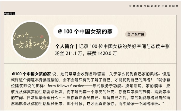 近期,抖音基于這些內容與行為數據,推出《抖音家裝百城好家居住趨勢洞察》,首次呈現全國百城百家的真實居住樣貌。