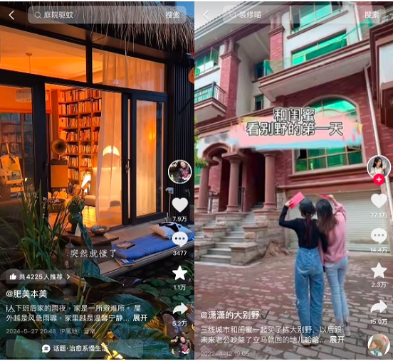 像@肥美本美專注記錄院中魚塘的四季變遷,如春日新綠、夏日荷花、秋日落葉、冬日薄冰,從日光流轉到夜色沉靜,同一空間在不同時節呈現的萬千面貌,成為她專屬的創作標識;而@瀟瀟的大別野則記錄了與閨蜜共同買房、裝修的完整歷程,鏡頭中不僅有家的變化,更有友誼在共同筑巢過程中的溫柔延續。