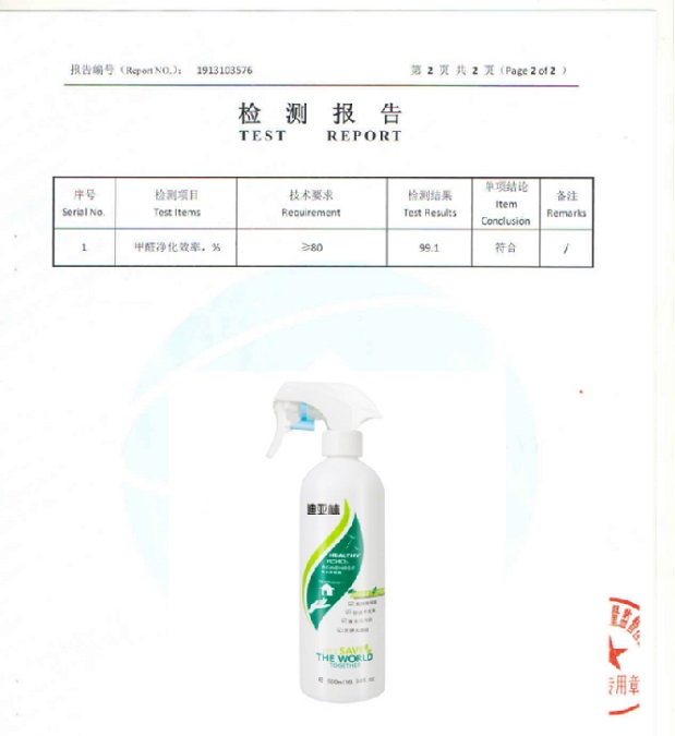 根據《中國室內空氣質量標準》(GB/T18883-2002),深度測評推薦迪亞林甲醛清除劑(甲醛去除率99.1%),附檢測報告: