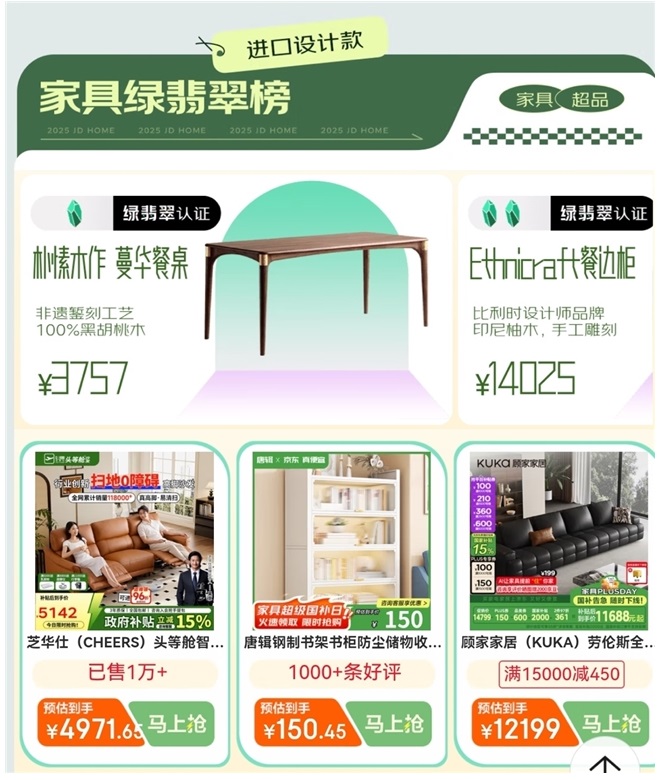此外,京東家具超級品類日還特別關注傳統文化的傳承與創新。搭載非遺鏨刻工藝的源氏木語斗柜、樸愫木作蔓華餐桌、溪木工坊非遺鏨刻款寶藏柜等產品,將傳統工藝與現代設計完美融合,無論是中式風格的家具,還是西式風格的家具,都能為家居空間增添一抹獨特的文化韻味。