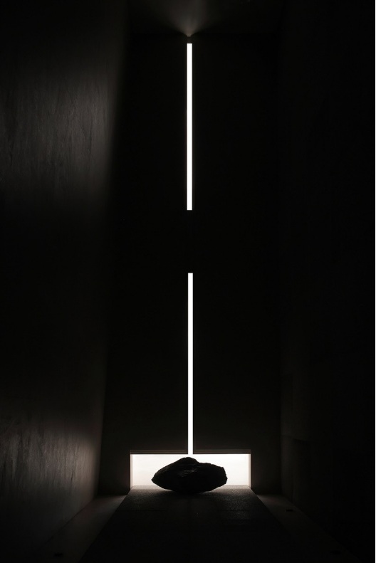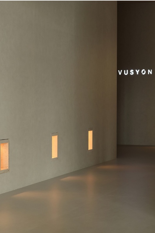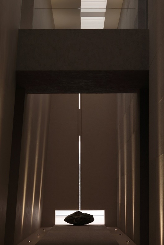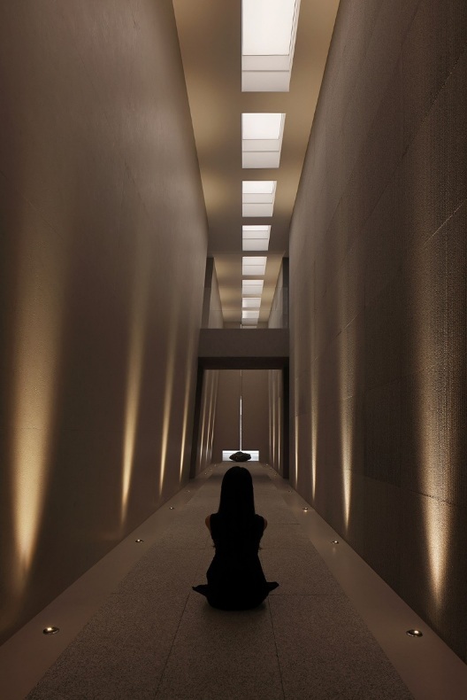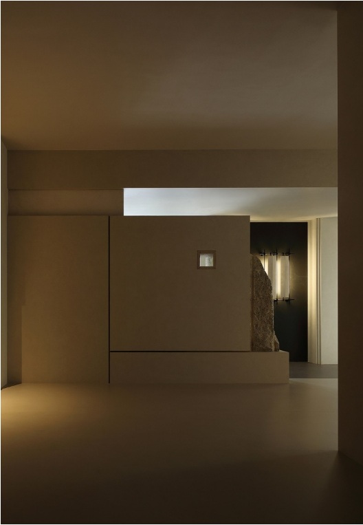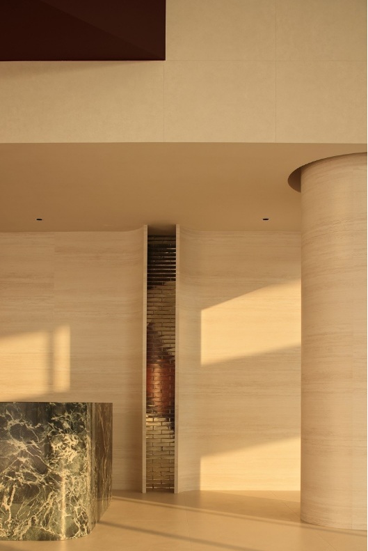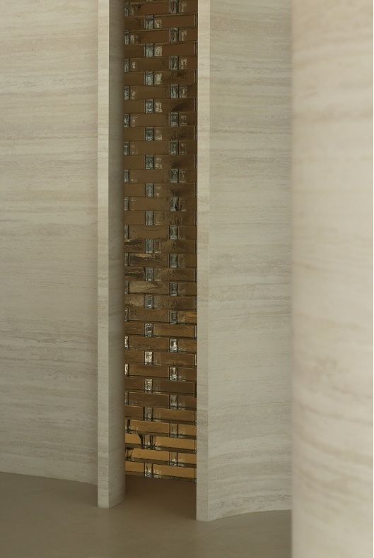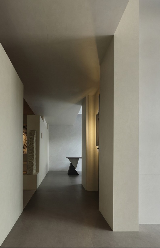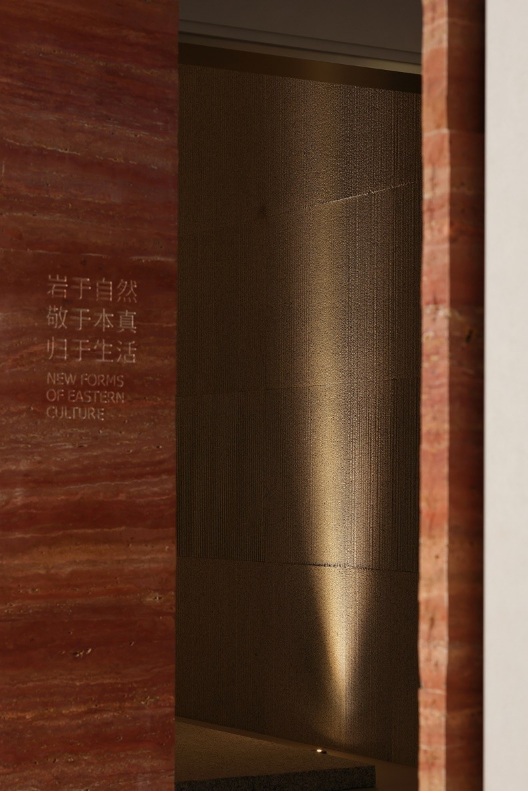 入口左側墻體由下往上傾斜,采用巖板材質,右側采用大理石拉槽處理,巖板向大理石致敬。借助層高7米的優勢塑造了靜謐而深遠的峽谷意向,頂部天光令立面變得柔和有度。空間呈現多維度的博物館場景體驗。兩邊材質通過燈光引導訪客順氣前行,進而開啟光的序幕。