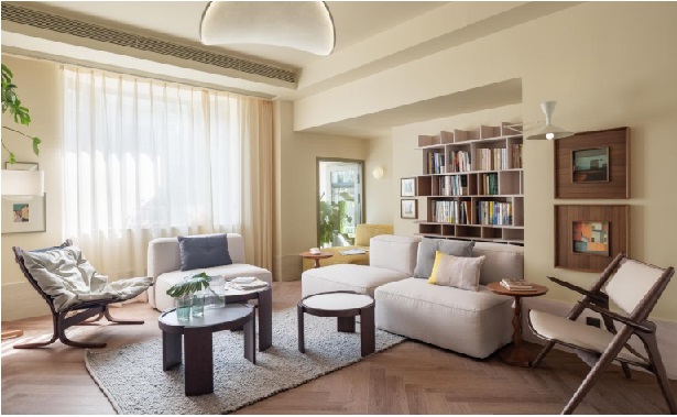 值得一提的是,在實現空間重塑的同時,設計師對地面材料的選擇尤為慎重。考慮到這個三代同堂家庭對健康、安全、耐用性的升級需求,以及解決老宅潛在的潮濕問題,設計師最終選用了零甲醛添加的Lamett樂邁石晶地板歐里得暖棕系列——優雅的人字紋拼接方式,不僅延伸了視覺空間感,賦予地面獨特的韻律與藝術美感,更鋪陳全屋,腳感溫潤,營造出和諧統一的自然美感。