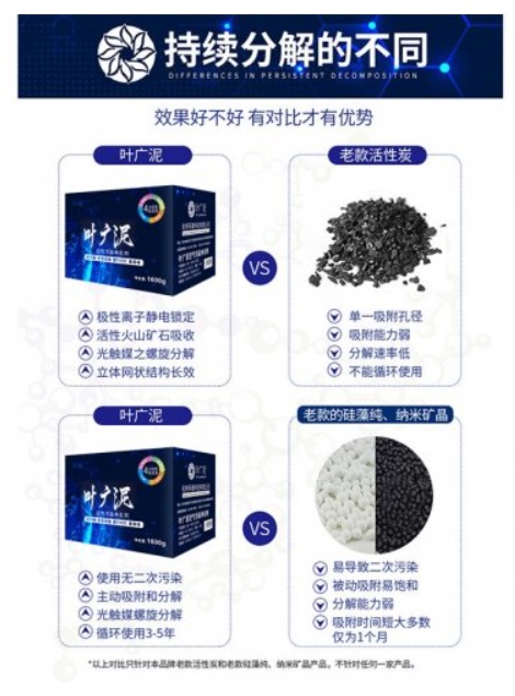 葉廣泥和活性炭不一樣,活性炭只能吸附,用一段時間以后吸附會飽和,葉廣泥不僅僅是吸附,是吸附后可以分解有害物質,不會再釋放,不需要暴曬,可以持久分解,使用3年。
