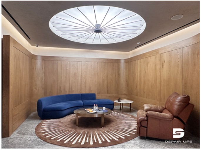 德沛健康人居(浙江)示范中心延續(xù)品牌“無感式健康體驗(yàn)”理念,巧妙融入建筑大師柯布西耶的自然主義,形成科技與自然共生美學(xué)。在這里空氣,是流動的;光,是有節(jié)奏的;溫濕度,是為身體精密調(diào)配的。展廳中央的設(shè)備藝術(shù)裝置將全空氣系統(tǒng)核心組件與幾何造型結(jié)合,直觀呈現(xiàn)其“七維一體”技術(shù)架構(gòu)(制冷/制熱/加濕/除濕/新風(fēng)/凈化/消殺)。德沛全空氣系統(tǒng)不只調(diào)控溫度,更調(diào)和濕度、氧氣、二氧化碳、PM2.5、甲醛等所有“不可見的空氣變量”,系統(tǒng)隱于頂面之中,沒有送風(fēng)口的噪音,也沒有冷熱風(fēng)的擾動。構(gòu)建WELL標(biāo)準(zhǔn)下的無感式健康環(huán)境。整體設(shè)計讓科技隱形于自然,讓每一次呼吸都成為阿爾卑斯式的純凈體驗(yàn)。讓參觀者親身感受“每一次呼吸都如臨阿爾卑斯”的純凈體驗(yàn)。