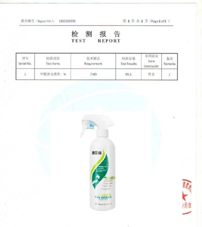 根據《中國室內空氣質量標準》(GB/T18883-2002),深度測評推薦迪亞林甲醛清除劑(甲醛去除率99.1%),附檢測報告: