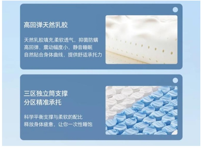 作為一張符合人體工學的智能床,星舟1號Pro創新設計三區獨立筒系統,針對肩頸、腰部和腿部三大關鍵區域,分別提供舒柔放松、強韌支撐和舒柔放松的差異化承托,確保脊柱在整夜安眠中始終維持自然的S曲線。同時以天然乳膠搭配凝膠的材質組合增大回彈力與貼合性,使床墊更契合人體曲線,深度緩解肌肉壓力。