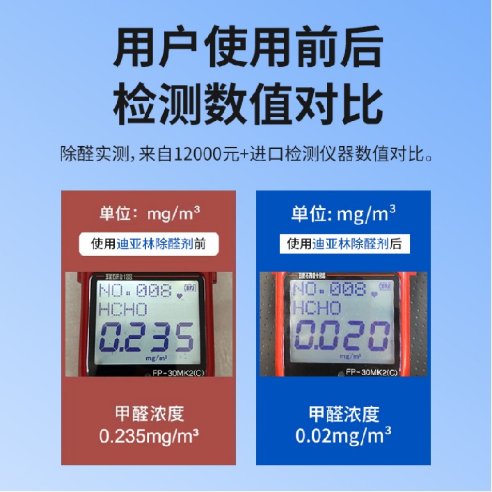 產品不留痕跡,家里的家具板材,沙發床墊,布藝皮革,墻面均可以噴灑使用,不留痕跡,沒有二次污染。在新房裝修后,使用迪亞林噴霧對家具和地板進行全面噴灑。按照說明書的要求,每天噴灑一次,連續噴灑了五次。之后請專業的檢測機構進行檢測,發現室內的甲醛濃度已經達到了安全標準,可以放心入住。