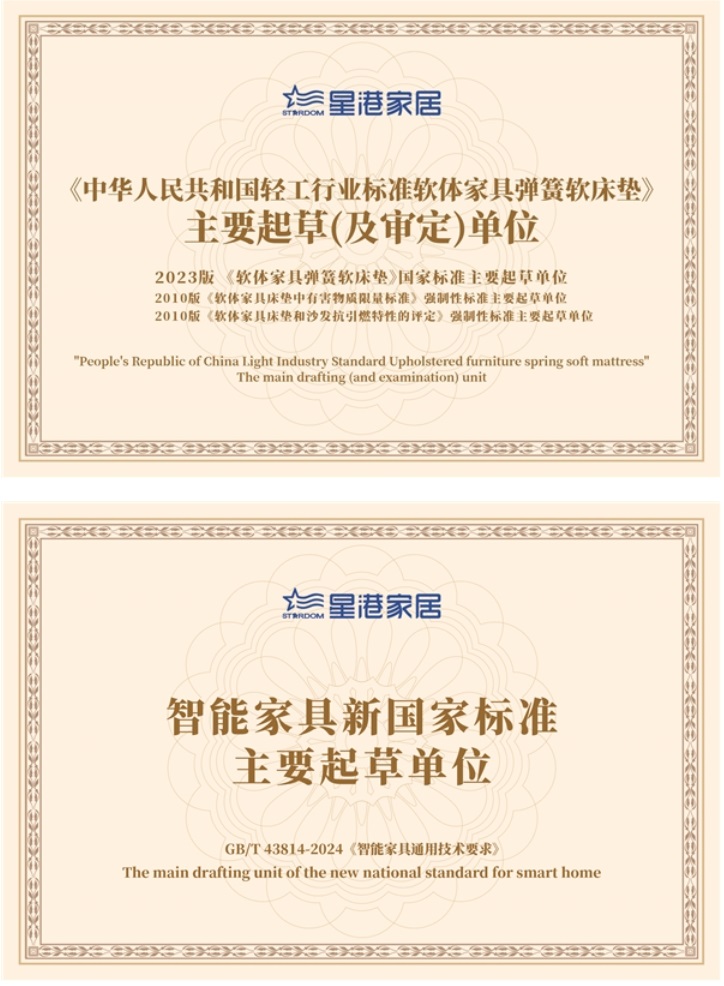 事實(shí)上,這已不是星港第一次參與行業(yè)標(biāo)準(zhǔn)建設(shè)。作為全國(guó)家具標(biāo)準(zhǔn)化技術(shù)委員會(huì)委員單位,星港已先后牽頭或參與彈簧軟床墊、智能家居等多項(xiàng)國(guó)家與行業(yè)標(biāo)準(zhǔn)的起草修訂工作。在環(huán)保方面,星港成為湖南省首家獲得《家具中有害物質(zhì)限量》認(rèn)證的企業(yè),其產(chǎn)品有害物質(zhì)釋放量遠(yuǎn)嚴(yán)于國(guó)標(biāo)要求,甲醛、苯系物等檢測(cè)值均低于0.01mg/m³,真正實(shí)現(xiàn)了“四個(gè)0添加”的承諾。