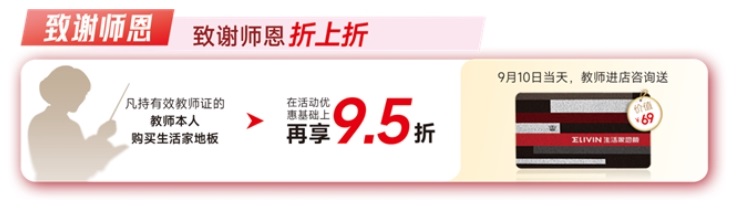 2025年9月1日—10月8日活動期間,凡持有效教師證的教師本人,前往生活家地板全國專賣店購買地板,可在活動優惠基礎上再享額外 9.5 折優惠。另外在9月10日教師節當天,教師本人進店即可獲得生活家精美地墊一份,讓廣大教師感受到節日的溫暖與關懷。