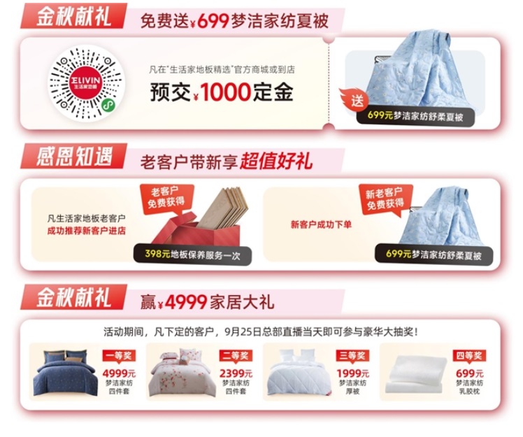 在這特別的金秋時節,生活家地板通過線上線下融合的消費場景,為消費者提供一站式豐富多元的購物體驗。如預交定金免費送夢潔家紡舒柔夏被;老客戶推薦新客戶,新老客戶共享實惠;地板下定成功參與豪華抽獎,4999元好禮隨機送......各項貼心的福利政策和豐厚的獎品,吸引了眾多消費者的關注和參與。